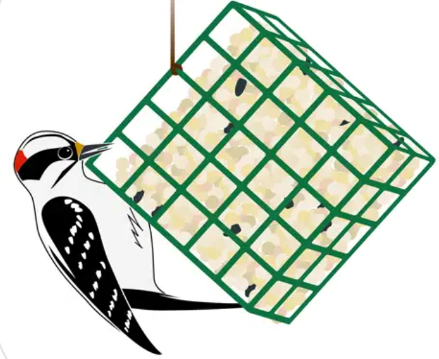 Left: A Downy Woopecker at a suet feeder signals the beginning of Feederwatch, Nov. 1
